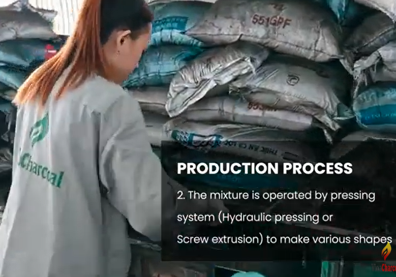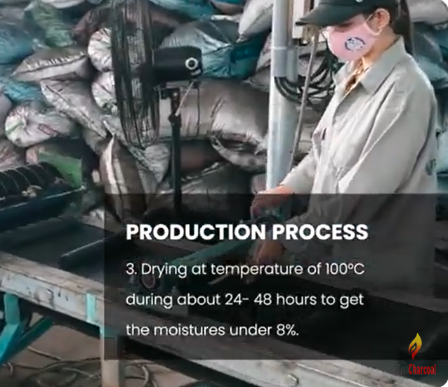 Then the mixed materials are put into the pressing system. There are two briquette pressing techniques : Hydraulic pressing and screw extrusion. Charcoal briquettes are then put into the drying kilns at a temperature of 100 degrees for about 24- 48 hours to get the moistures below 8%. The next process is cooling and packaging .